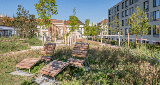 Der Quartiergarten bietet für die Entspannung Suchenden Holzliegen und Sitzplätze unter der Pergola und für die Aktiven Generationenspielgeräte und einen Spielplatz für die Kleinen.